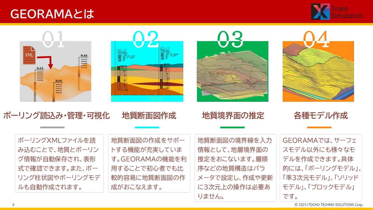 本講演は、3次元地質・地盤モデリングソリューション「GEORAMA」の基本機能から最新バージョンの紹介、モデル作成のコツ・ポイントなど、盛りだくさんの内容で地質・地盤のモデル作成の“いま”をお伝えしました。さらに、活用事例やカスタマイズ事例など、GEORAMAの柔軟な活用可能性についてもご紹介しました。