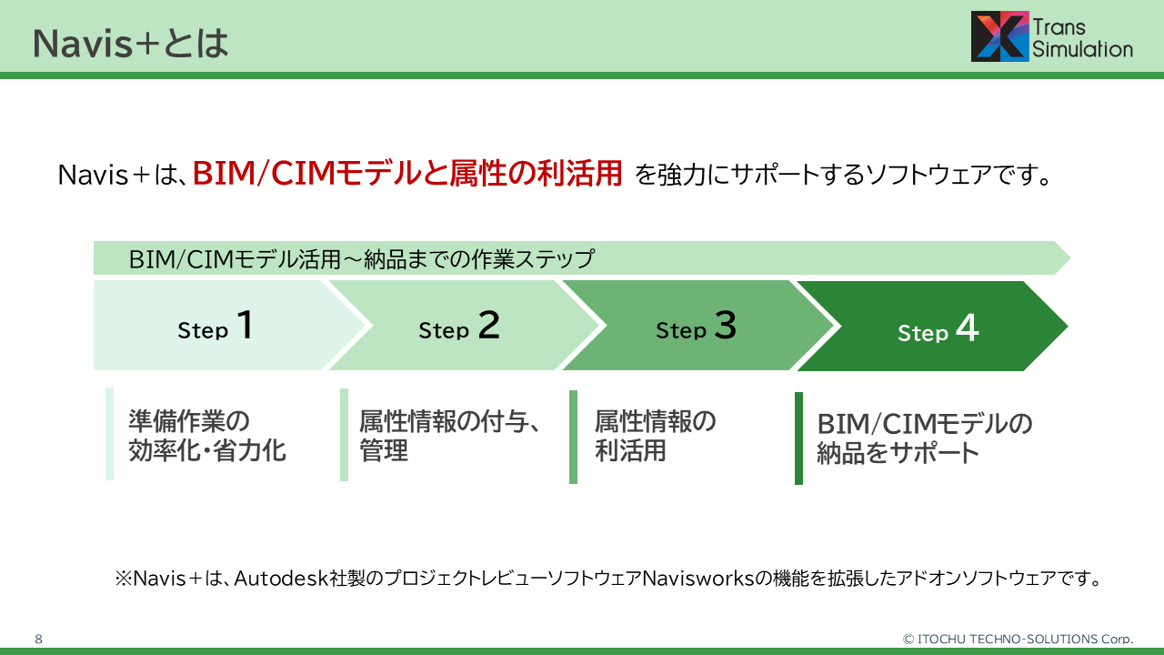 本講演では、BIM/CIM対応を一括サポートするパッケージ にアップグレードした3次元属性管理ソリューション「Navis+」の主要機能や新機能をベースに “データ利活用”についてご紹介しました。施工現場見える化サービスの「C-シリーズ」はNavis+の代表的なカスタマイズ事例で、計測データなどからの自動モデリング・自動属性付与は業務効率化に繋がります。