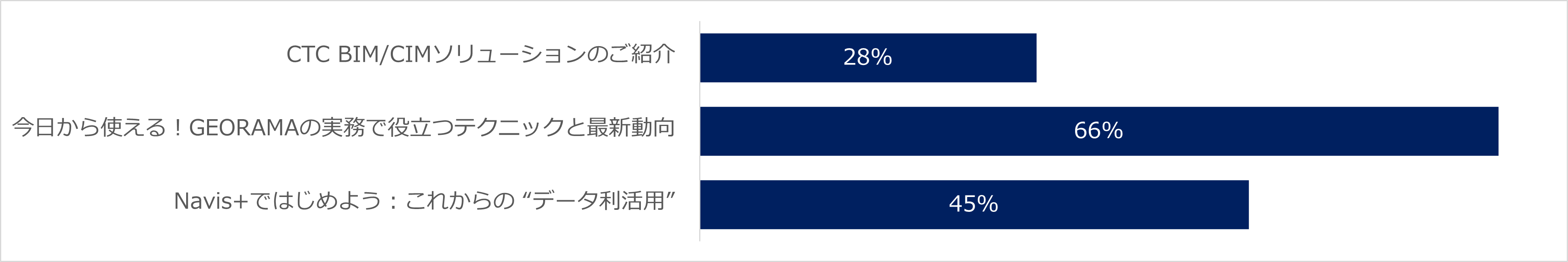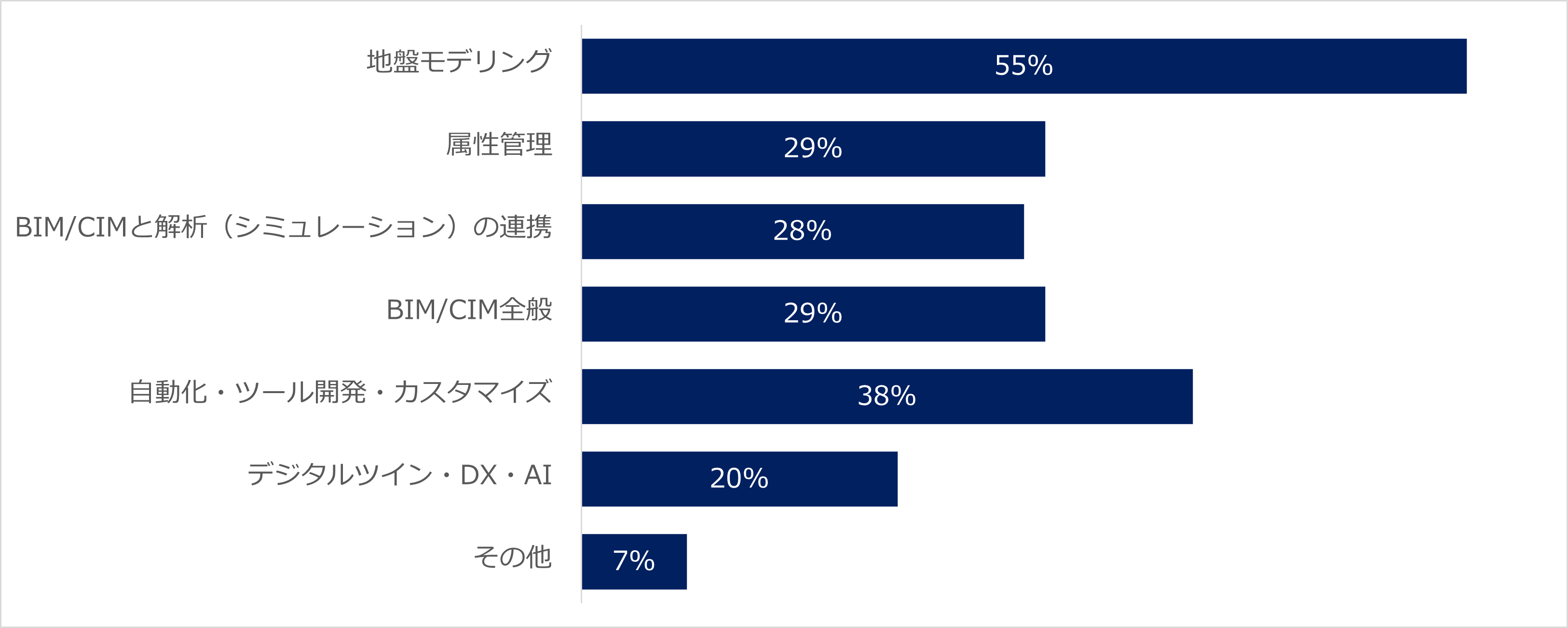 ご参加いただいたお客様はBIM/CIMやDXに対して様々な課題をお持ちでした。特に地盤モデリングに関しては回答いただいた方の半数以上となっていて、興味のあった講演のGEORAMAと合わせて関心の高さがうかがえる結果でした。