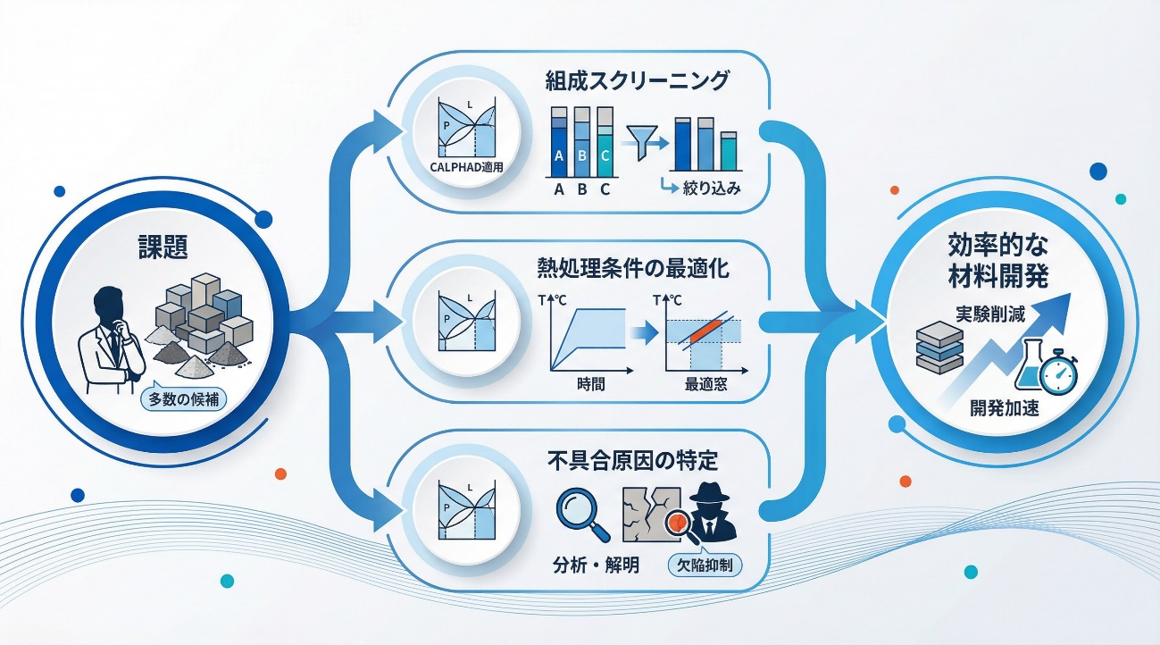 CALPHADは特に設計検討段階で効果を発揮します。 ここでは代表的な活用シーンを紹介します。