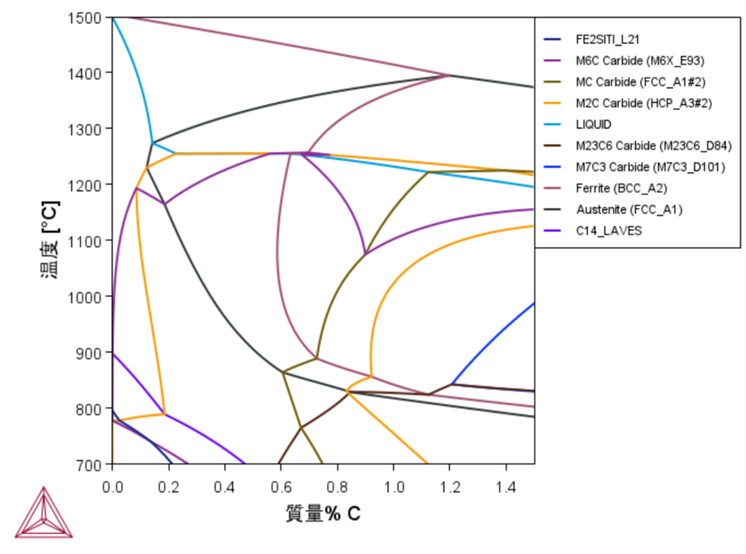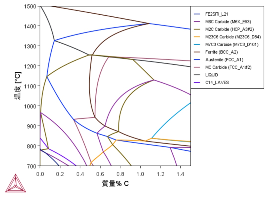 例えば、M42高速度鋼のようなFe-Cr-Mo-W-V-Mn-Si-Cの8元系においても、以下のように状態図を算出することができます。 「Moをもう少し増やしたら状態図はどう変わるのか」という疑問が生じた際にも、CALPHADならMo量を変更するだけで、安定相の変化をすぐに把握することが可能です。